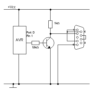 Da wir uns den Einsatz eines Pegelwandlers mit Inverters (MAX232 o.ä.) sparen wollen müssen wir das Signal des UART Ausgangspins invertieren. Dazu dient der Transistor, dessen Basis über den 10kW Vorwiderstand angesteuert wird. Am Kollektor greifen wir das invertierte Signal ab und leiten es zum Eingang der seriellen Schnittstelle am PC. Die meisten (eigentlich alle) PC's kommen mit 0 und 5V auf der RS232-Schnittstelle problemlos zurecht. Wer es ganz genau haben will kann aber natürlich auch einen integrierten Baustein wie den MAX232 einsetzen.