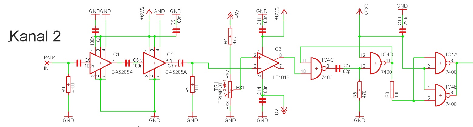 Verstärkung+Pegel Komparator+Monoflop+2 Restgatter missbraucht für
